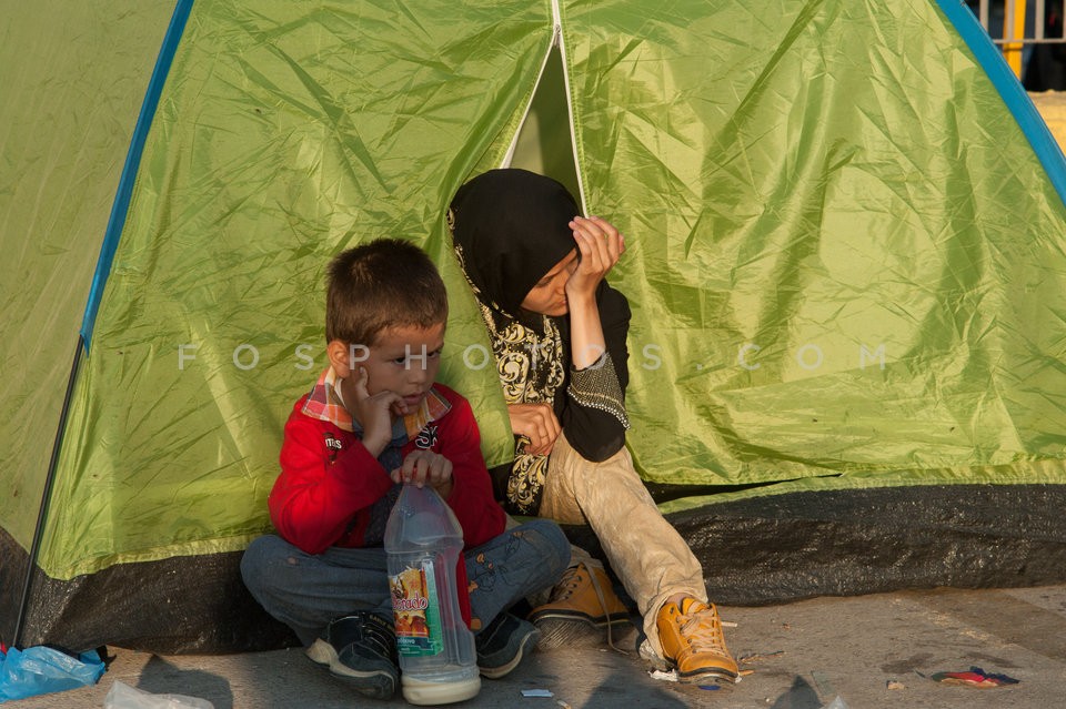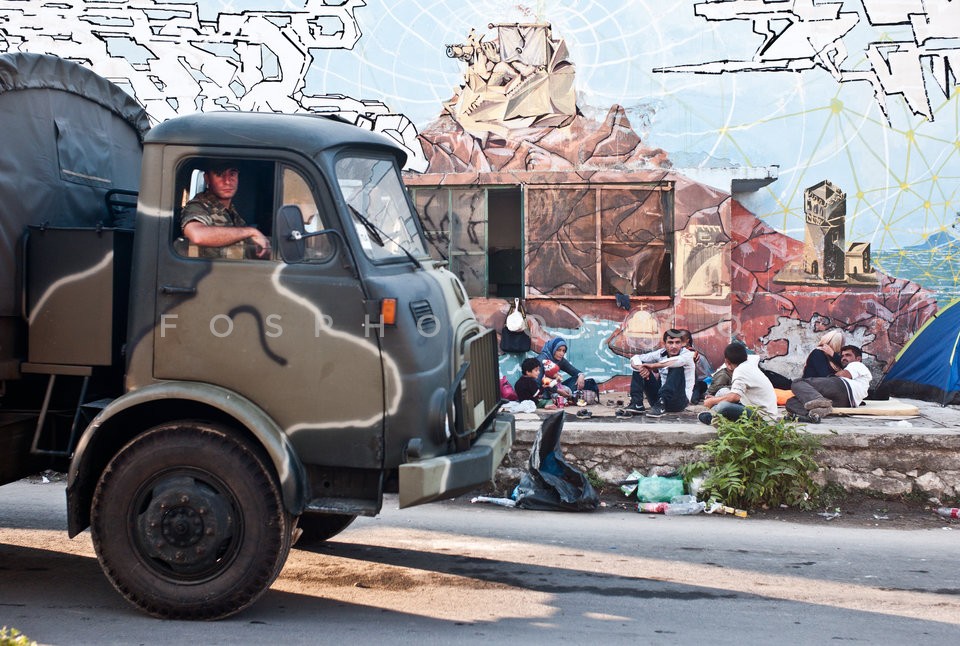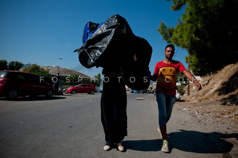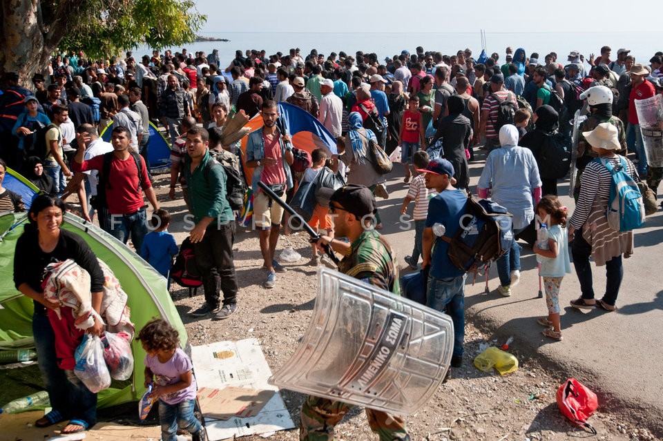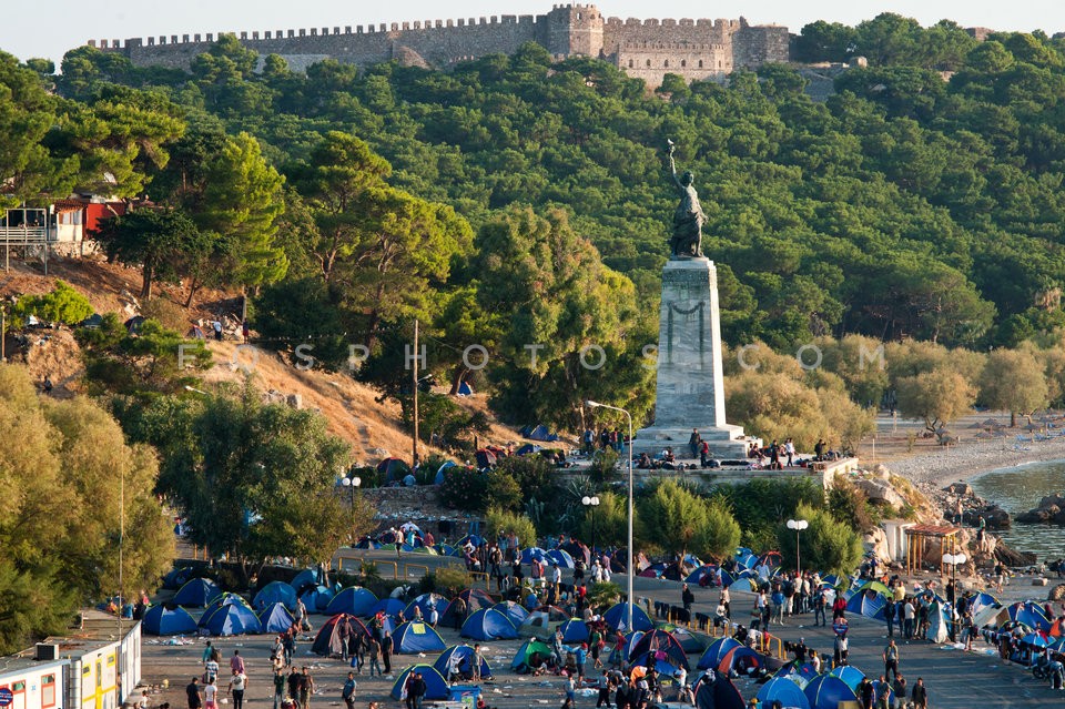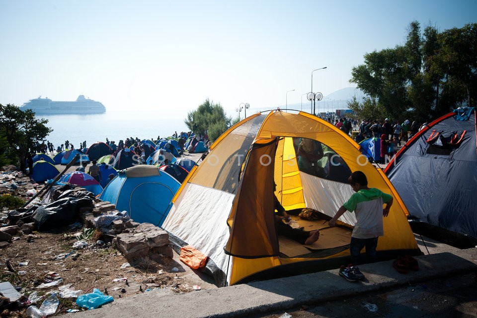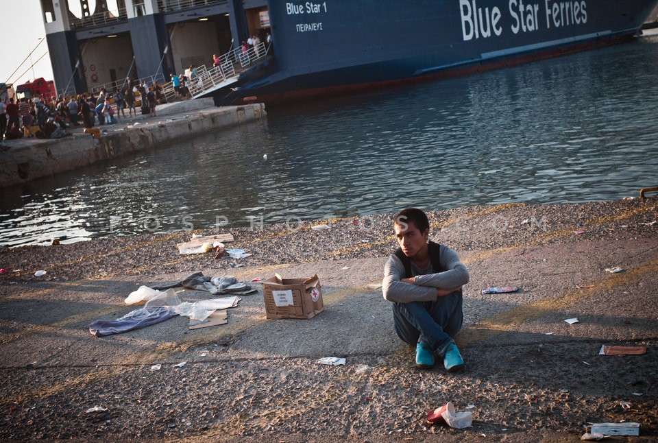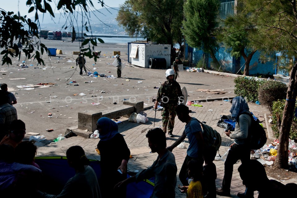 Refugees at the port of Lesvos island aw…