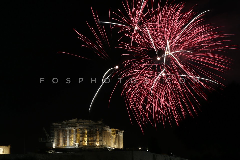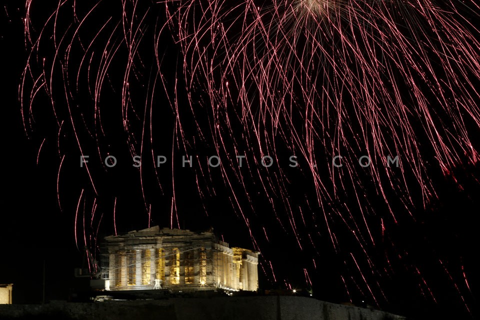 Fireworks over the ancient temple of the…
