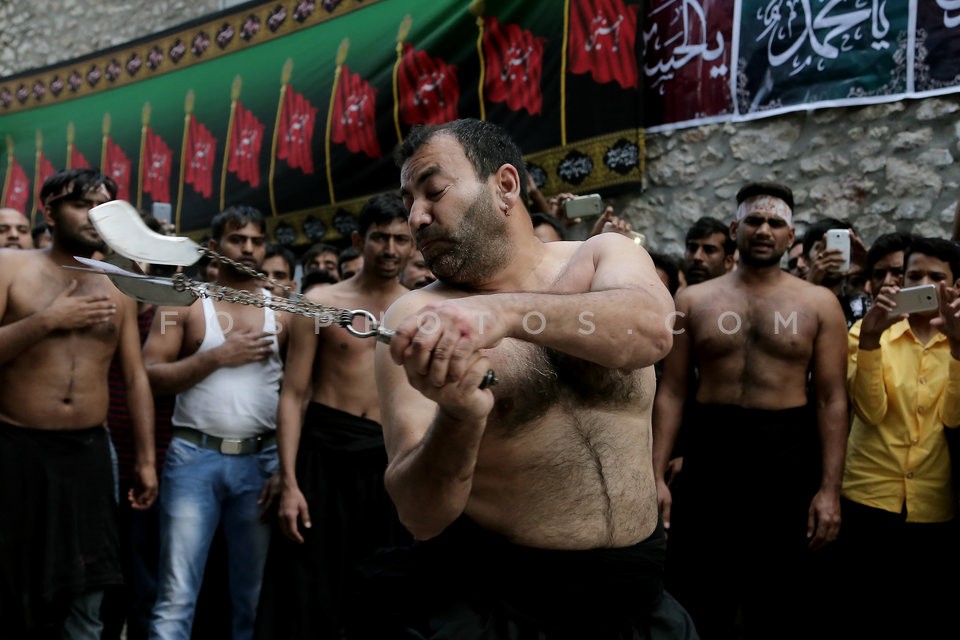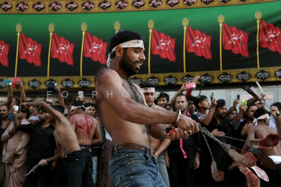 A Shiite Muslim flagellates himself, tak…