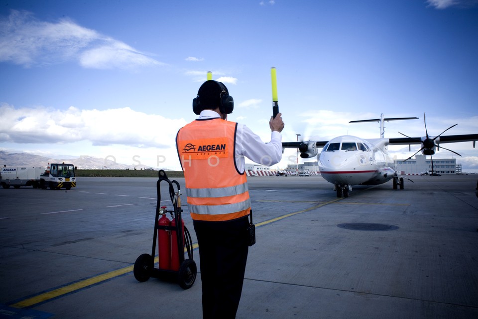 Air traffic controller signaling to an airplane