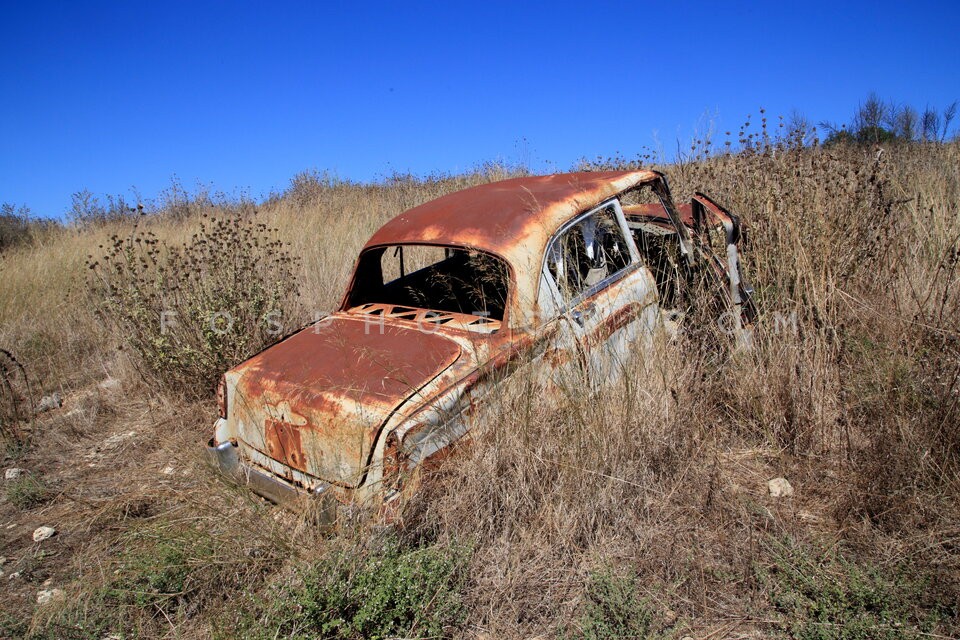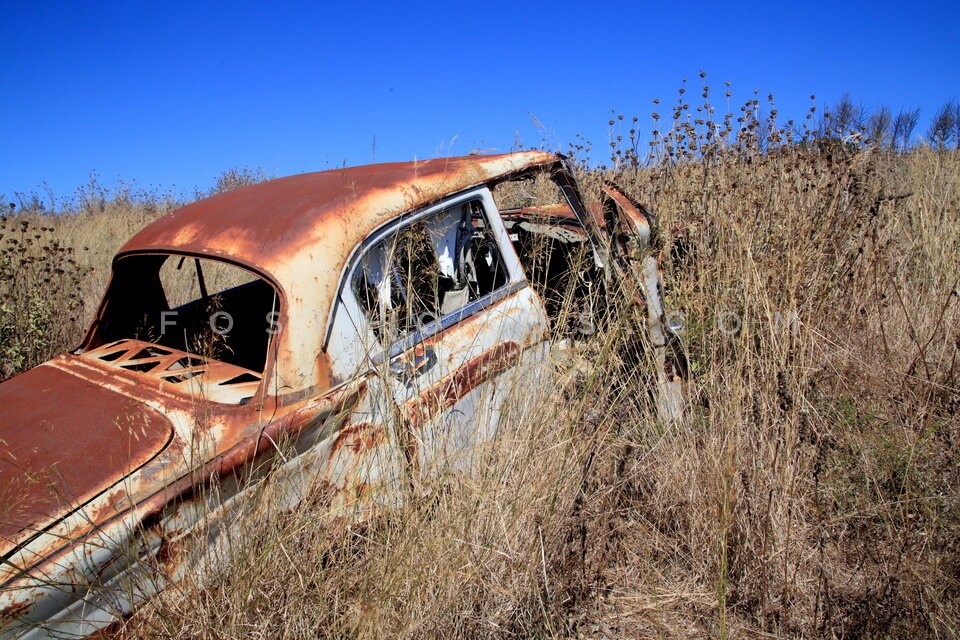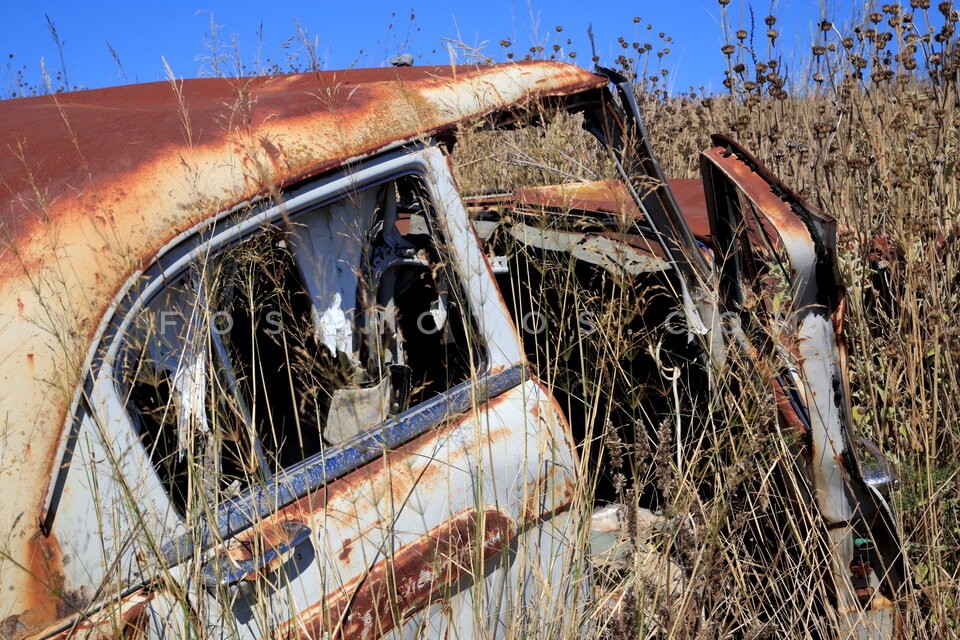 Rusty car lying abandoned in a field. Ep…