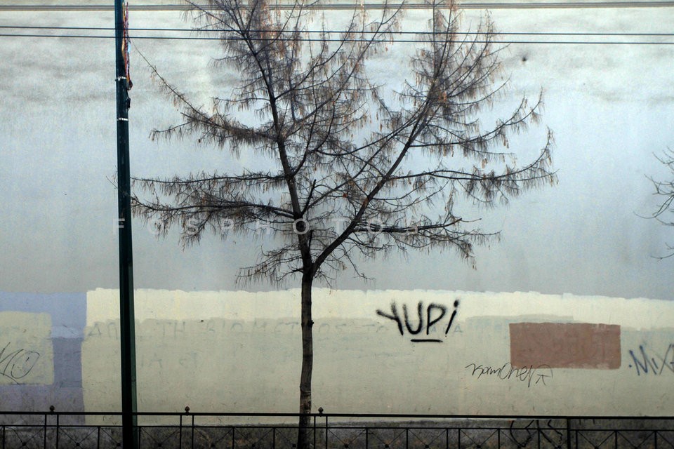 Sidewalk with a tree . Athens on January…