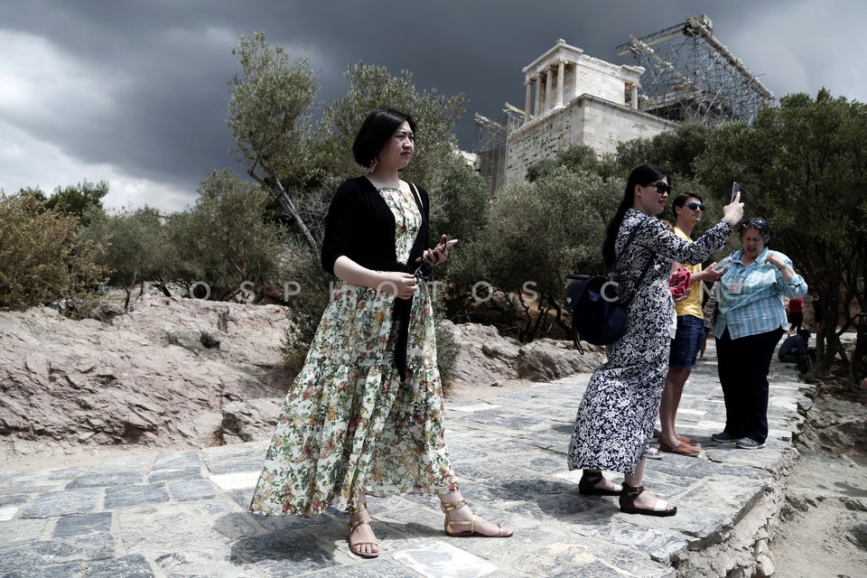 Tourists at the Athens Acropolis. Early …