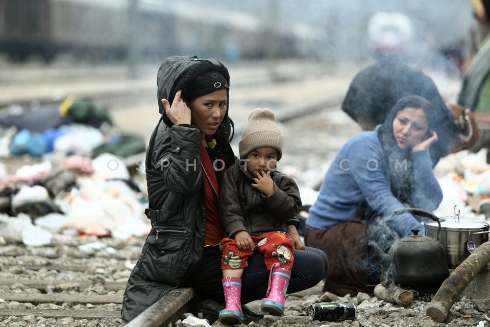 Migrants on the railway rails during a p…