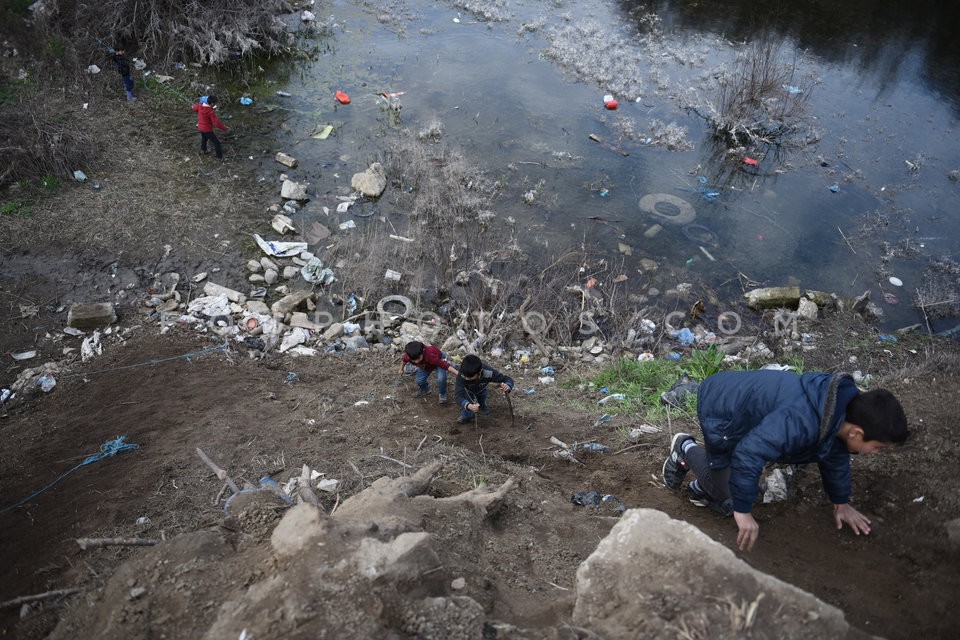 Immigrants dry their clothes on a wire a…