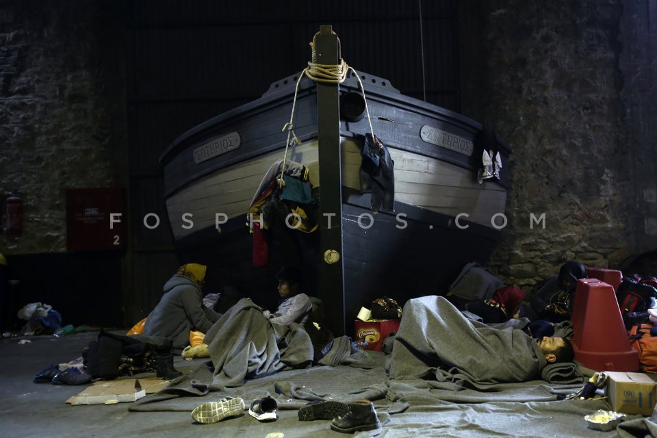 Migrants sleep inside a warehouse at Pir…