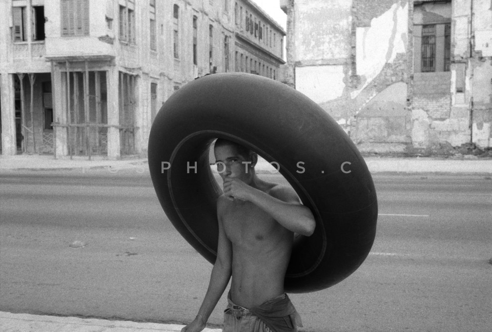 Man with tyre tube on his head, Havana, …