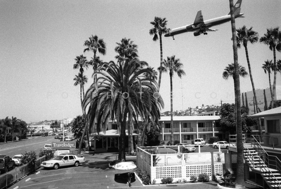 Airplane flying over a motel in San Dieg…