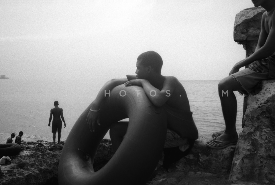 Young man with tyre tube, Malecon beach,…