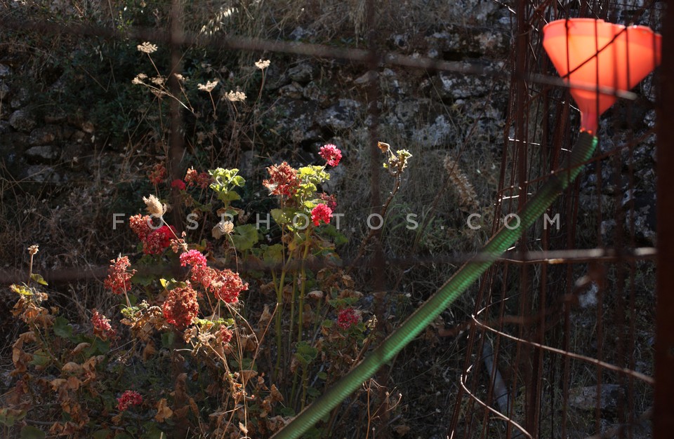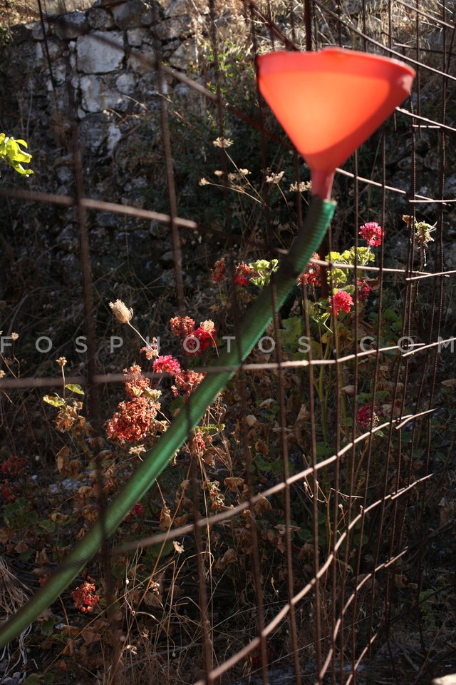 Red funnel on a fence, Agia Sofia in Eri…