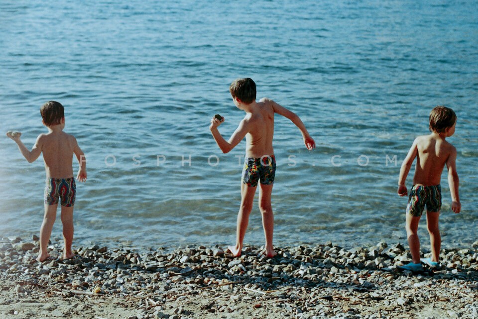 Three small boys throwing stones in the …