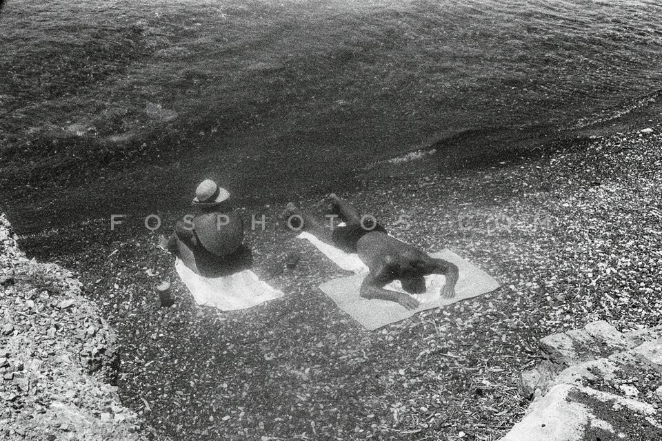 A couple of bathers sunbathing at the be…