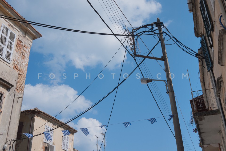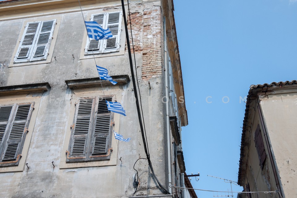 Flags on buildings in Corfu city, Corfu …