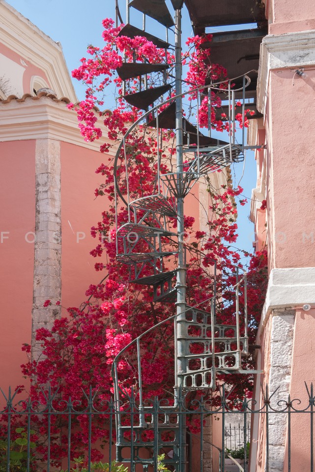 Bougainvillea on building stairs in Corf…