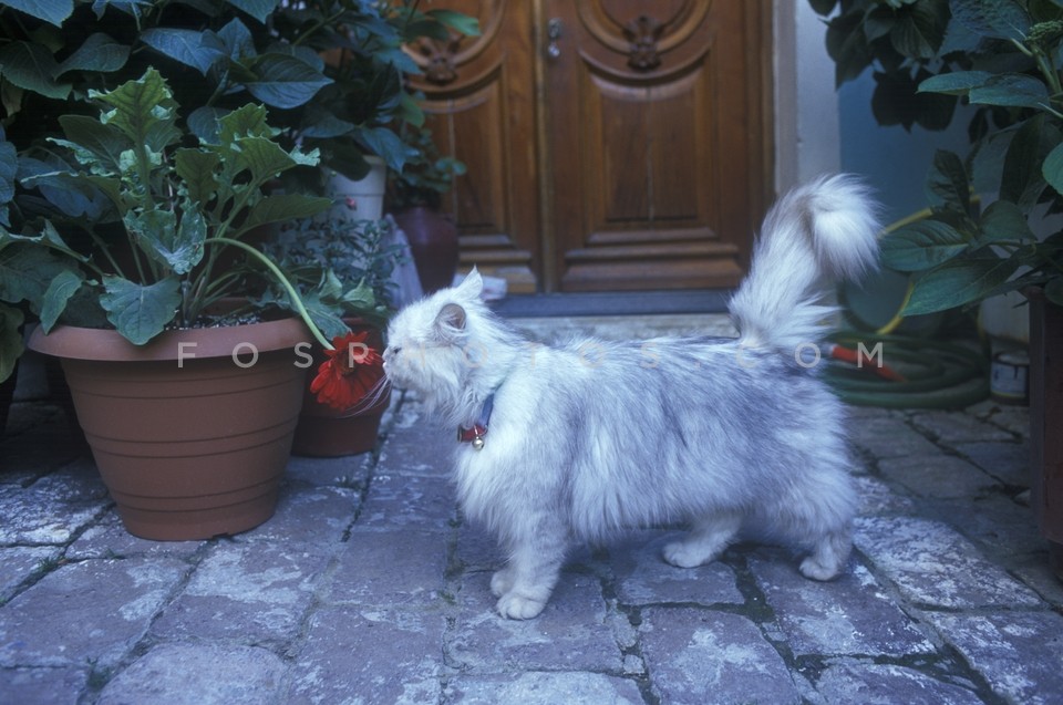 Cat smelling a red flower in the village…