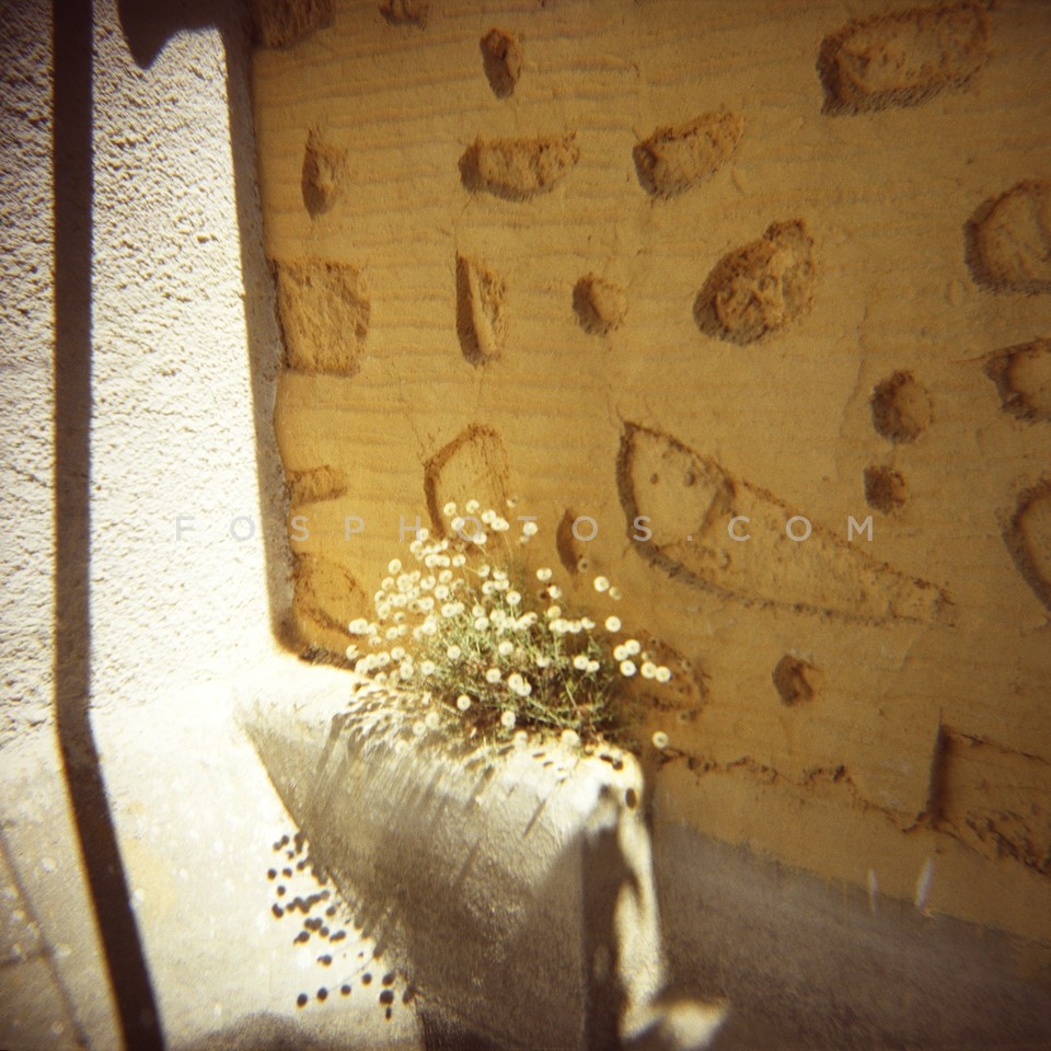 Wild flowers against stone wall, Syros Island