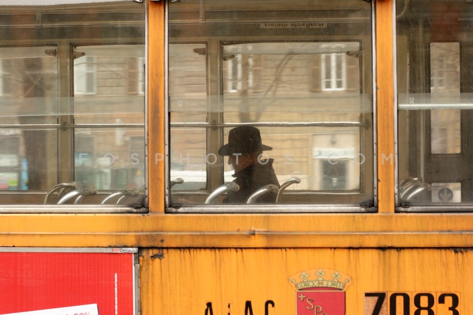 Man wearing hat on a public bus in Rome, Italy