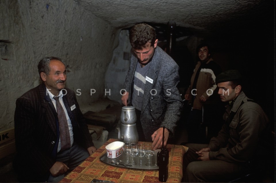 Men drinking tea inside a cave in Cappad…